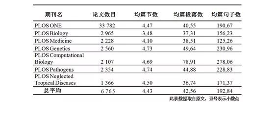 表1给出了巴黎索邦大学的马克·贝尔坦(Marc Bertin)等针对发表在PLOS ONE的七种期刊上的47362篇论文进行了分析。统计了论文数目、均篇节数、均篇段落数和均篇句子数。平均有192.84个句子,42.56个段落。两者相除为4.53。